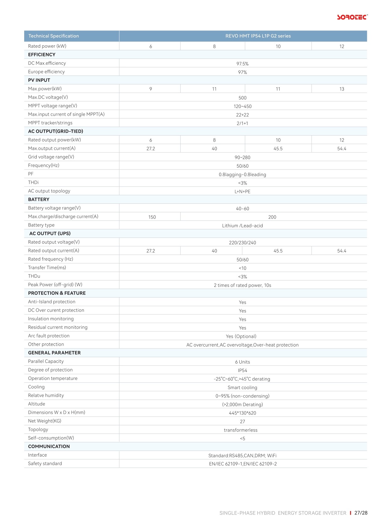 REVO HMT G2-IP54 is an outdoor-grade single-phase hybrid energy storage inverter designed to handle diverse installation environments. This series offers flexible power options ranging from 4kW to 11kW. With an IP54 protection rating, it withstands dust and water splashes, ensuring stable operation in semi-outdoor settings like garages and sheds. The product integrates a high-efficiency MPPT solar charger with an intelligent battery management system, supporting flexible connection and smart scheduling of three energy sources: photovoltaic, grid, and battery. It enables both off-grid standalone power supply and grid-connected operation.