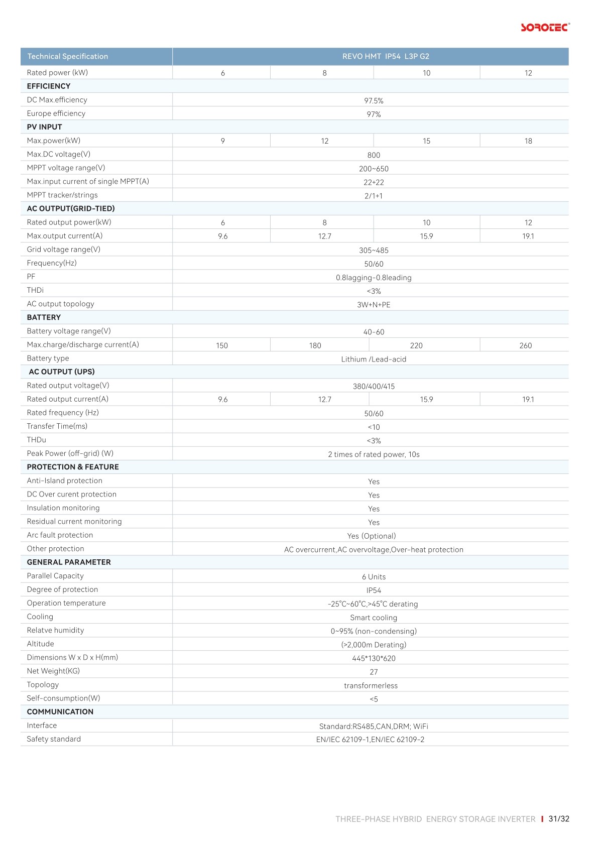 Three-Phase IP54 REVO HMT IP54 L3P G2 Hybrid Energy Storage Inverter 6-12kW Manufacturer – SOROTEC compared with similar products on the market, it has incomparable outstanding advantages in terms of performance, quality, appearance, etc., and enjoys a good reputation in the market.SOROTEC summarizes the defects of past products, and continuously improves them.